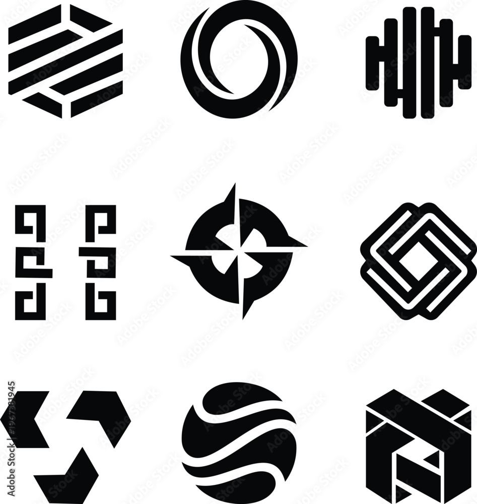 This abstract geometric icon set features diverse of modern designed with clean lines, balanced shapes, and creative sigs. This includes a, squares, hexagons, grids, waves, spirals, and layered patter #1967381945