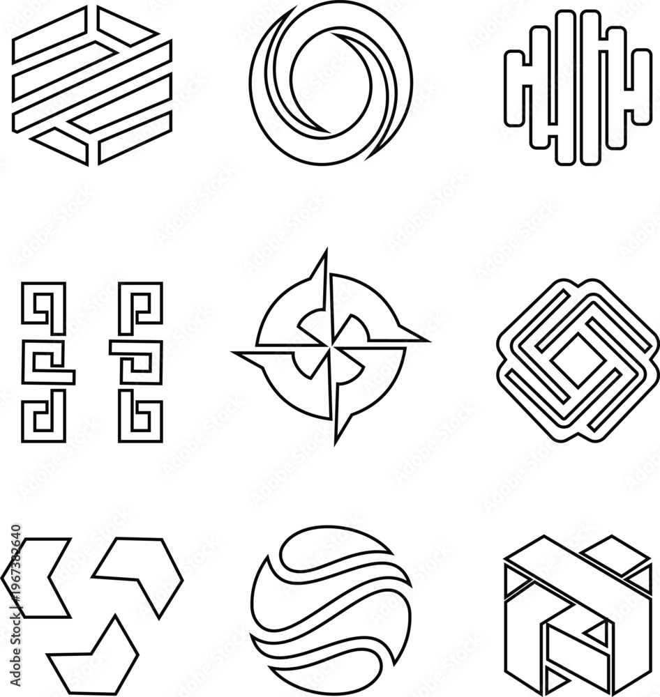 This abstract geometric icon set features diverse of modern designed with clean lines, balanced shapes, and creative sigs. This includes a, squares, hexagons, grids, waves, spirals, and layered patter #1967382640