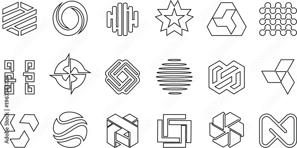 This abstract geometric icon set features diverse of modern designed with clean lines, balanced shapes, and creative sigs. This includes a, squares, hexagons, grids, waves, spirals, and layered patter #1967383729