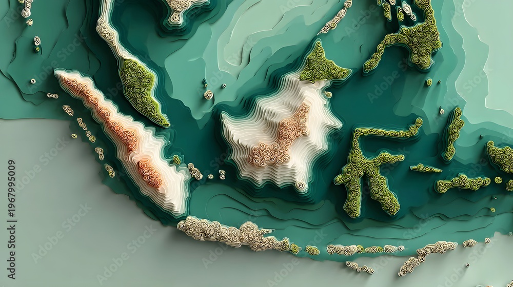This 3D aerial image showcases a stunning tropical island with vibrant greenery and pristine sandy beaches. The island's lush vegetation and textured terrain are highlighted in this detailed #1967995009