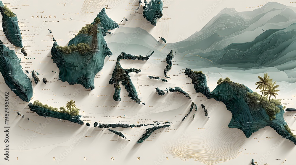 This 3D illustration depicts a stunning tropical island with pristine sandy beaches and majestic green mountains. The island is covered in lush foliage and features several palm trees. #1967995002