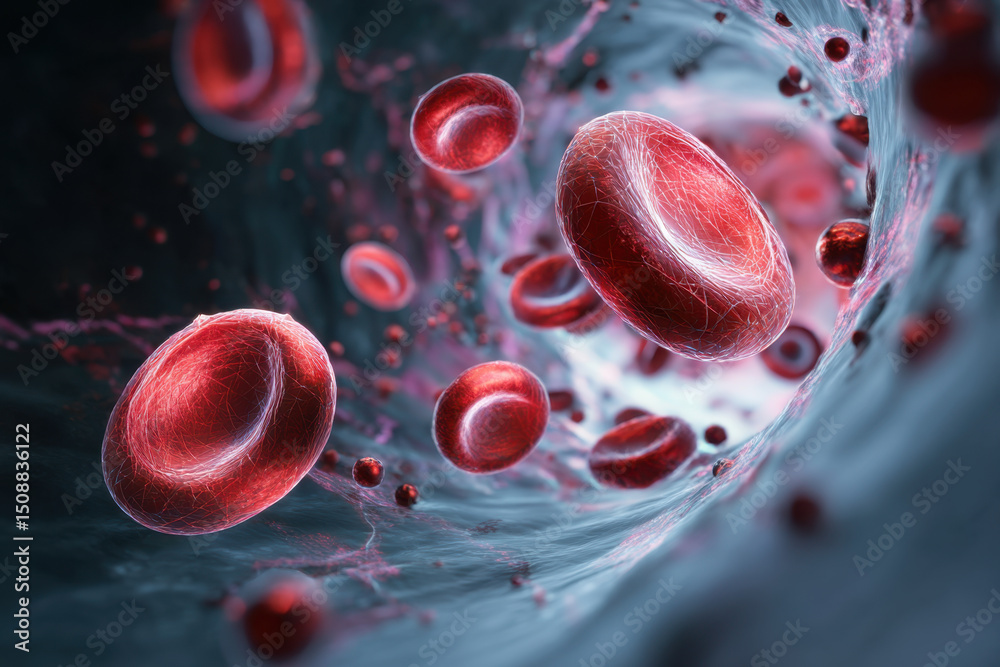 This depiction highlights the impact of vein disease on blood circulation, illustrating damaged valves that compromise the flow of healthy and unhealthy blood cells toward the heart #1508836122