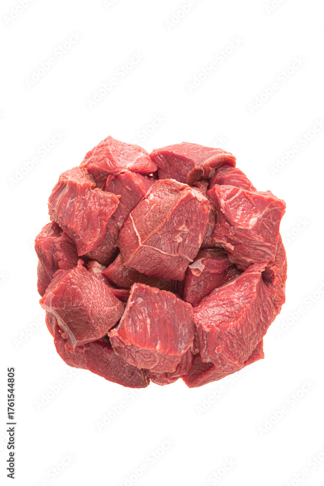 This display features fresh, cut pieces of red meat isolated on a clean white background, ideal for food presentation and culinary design. #1761544805