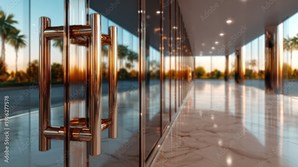 This image captures a stylish glass door handle in a modern lobby setting, showcasing sleek design elements against a backdrop of palm trees and reflective surfaces. #1916277578