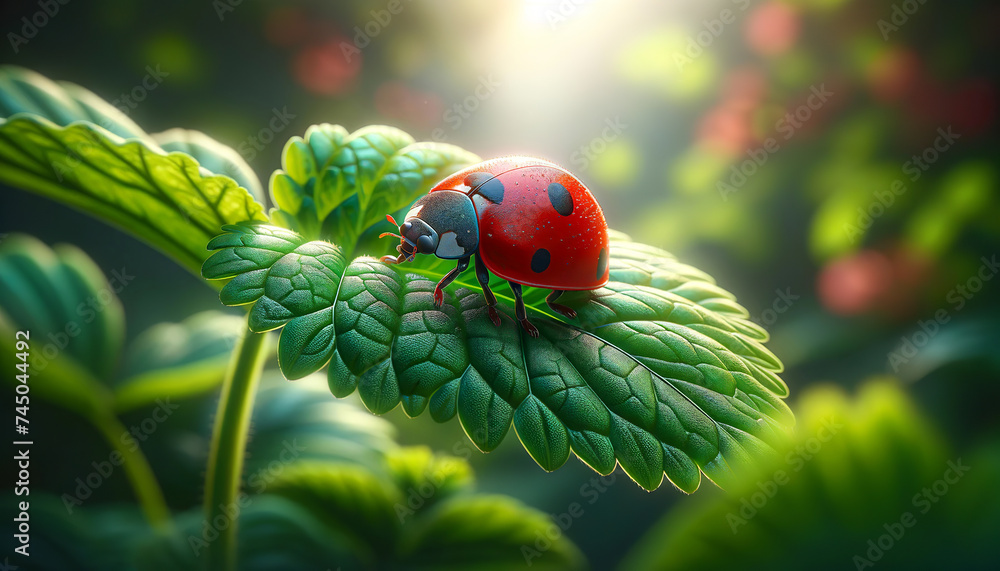 This image shows a ladybug on a vibrant green leaf with a soft-focus background, illuminated by a sunlight glow, symbolizing nature's delicate balance.Animals behaving concept.AI generated. #745044492