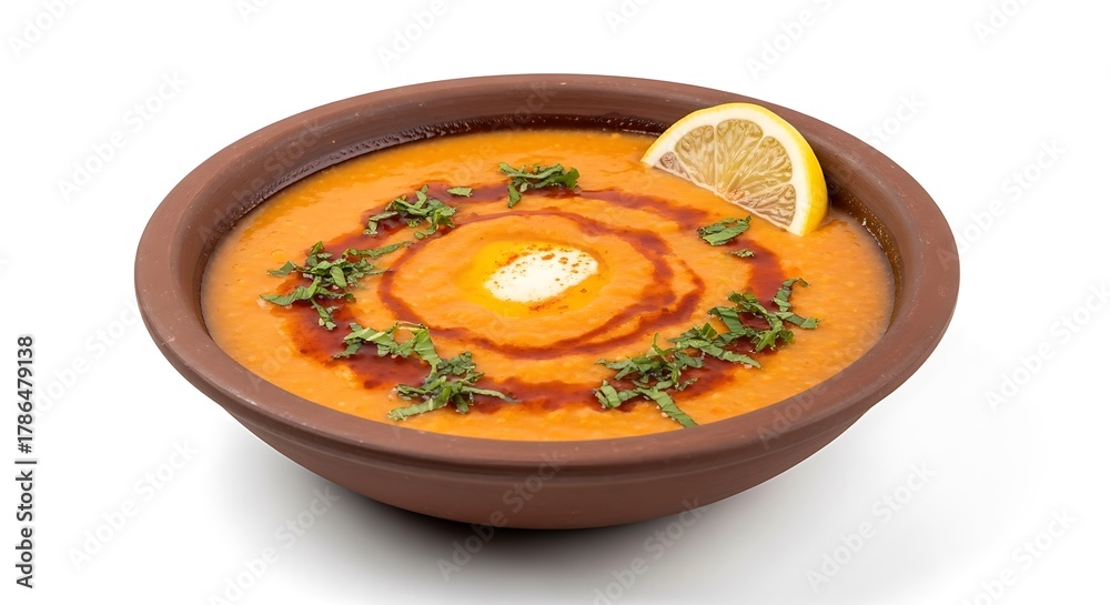 This inviting image showcases a rustic terracotta bowl filled with a steaming, vibrant orange Turkish Lentil Soup, known as Mercimek Çorbası, presented on a clean white background #1786479138