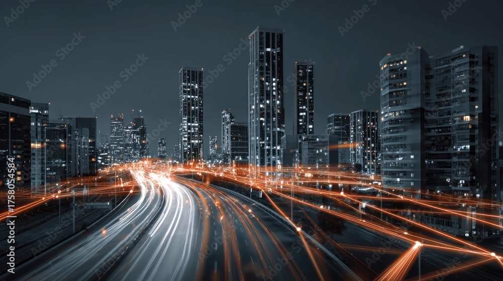 this is an abstract night time streetscape with a focus on traffic light patterns. the city skyline is faintly visible in the background, suggesting urban density #1758054584
