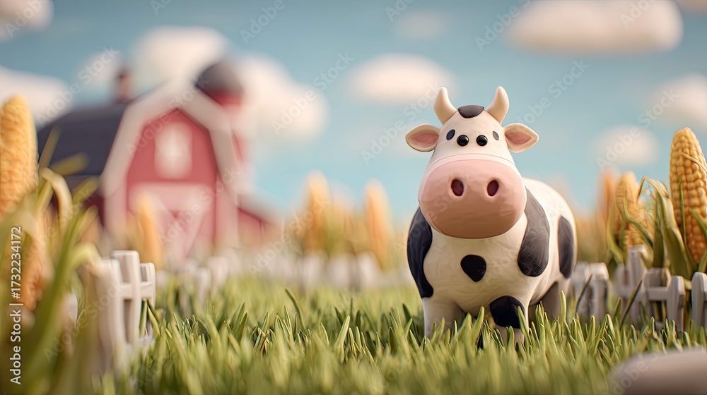 this is an animated image featuring a cartoon cow standing in a lush green field with golden wheat and a red barn with white windows in the background #1732234172