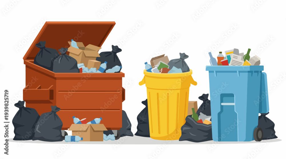 This realistic image displays two overflowing trash bins filled with various types of waste, highlighting environmental issues related to waste management and recycling. #1939825719