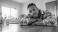 Thoughtful Portrait: A contemplative individual, embodying serenity, leans casually on a wooden table in a domestic interior, engaging the viewer with a gaze of depth. #1620045757