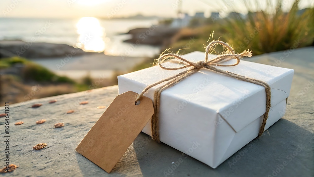 Thoughtful white gift box adorned with rustic twine and a blank tag, beautifully presented against a warm, sunlit coastal background, perfect for special occasions and heartfelt gestures #1664641211