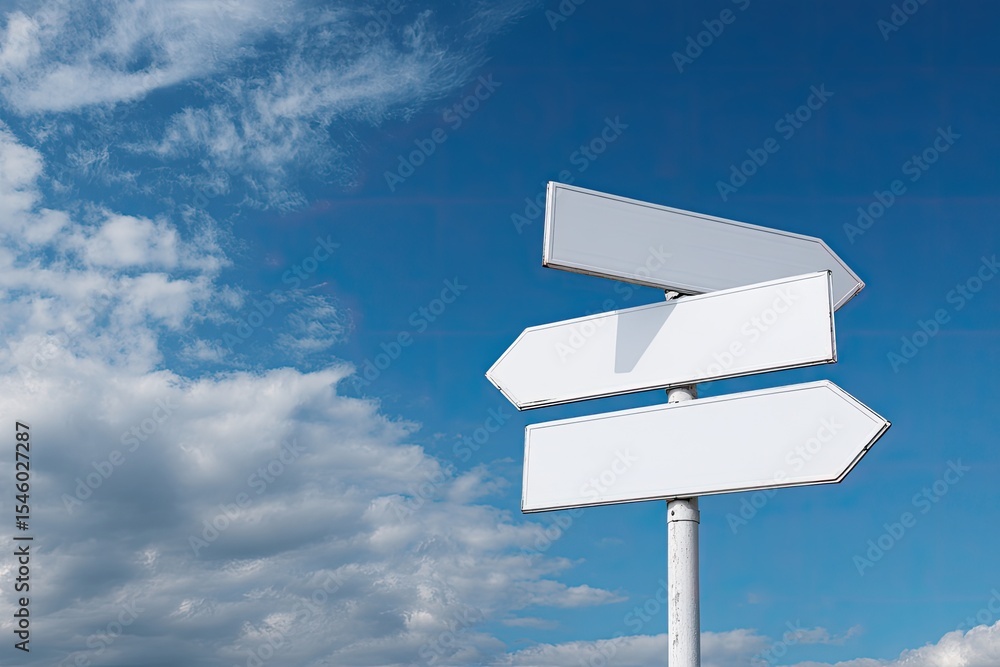 Three blank white directional signs on a post against a partly cloudy blue sky #1546027287