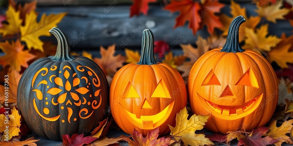 Three carved pumpkins, different designs, autumn leaves, jack-o-lantern, objects #1968107363