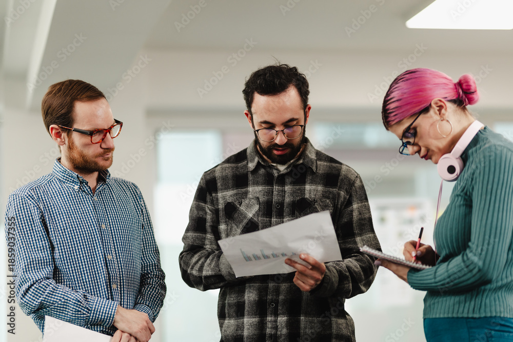 Three colleagues collaborate in a modern office, reviewing documents and charts, taking notes during a casual team meeting as they discuss data, ideas, and project progress #1859037355