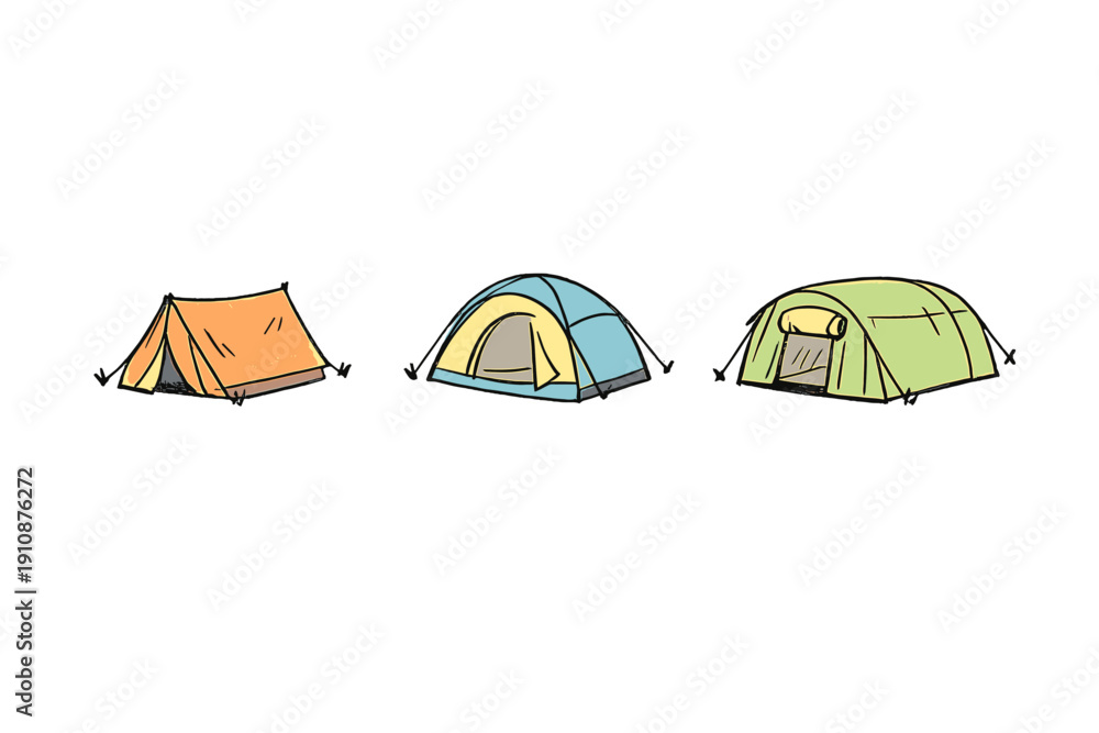 Three colorful camping tents in orange, blue, and green are illustrated against a solid black background. The hand-drawn style features simple outlines and vibrant colors for outdoor gear. #1910876272