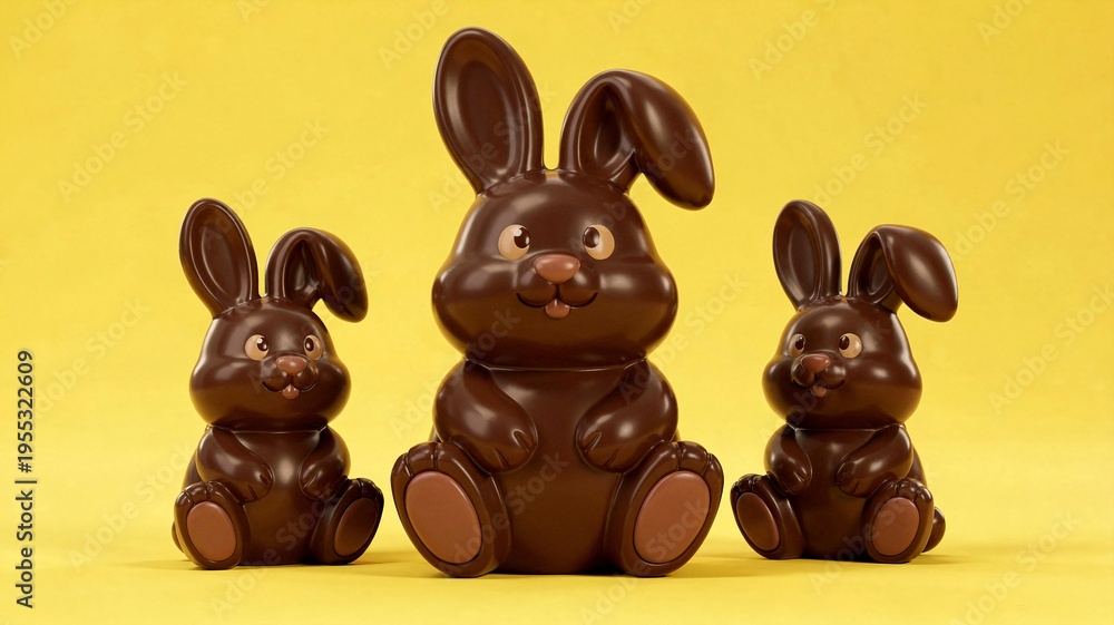 Three cute Easter chocolate bunnies with glossy surface on yellow background, festive template for Easter cards, banners and marketing campaigns #1955322609