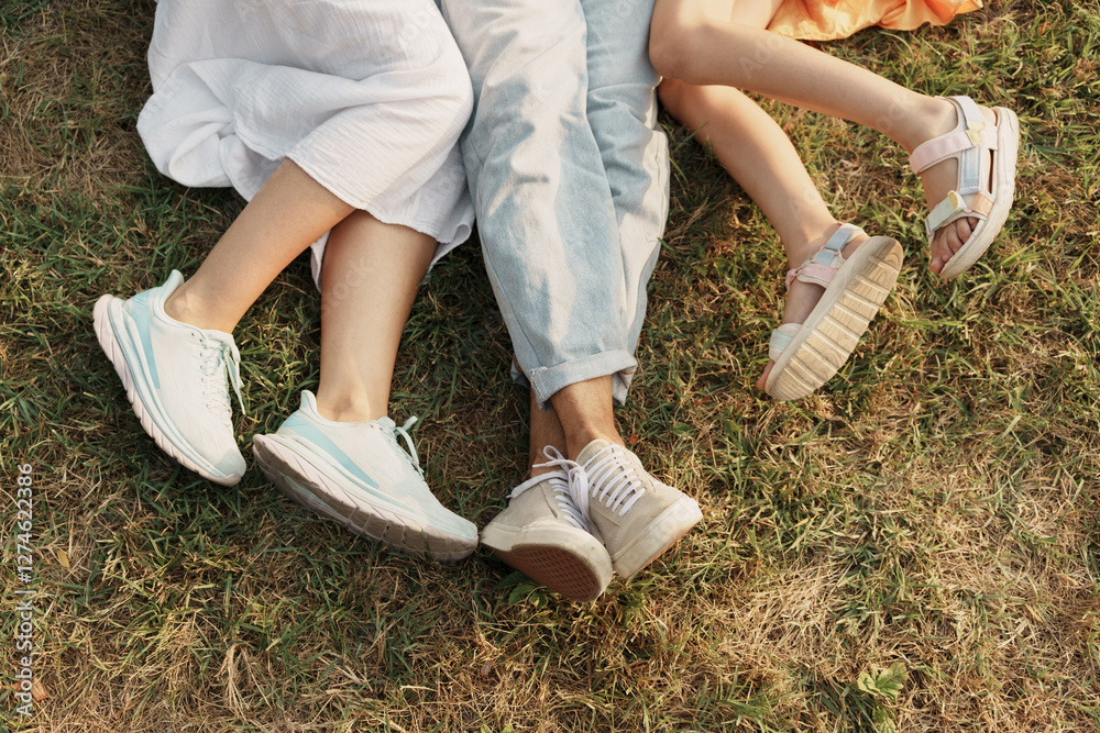 Three family members relaxing on grass showing legs and different shoes. #1274622386