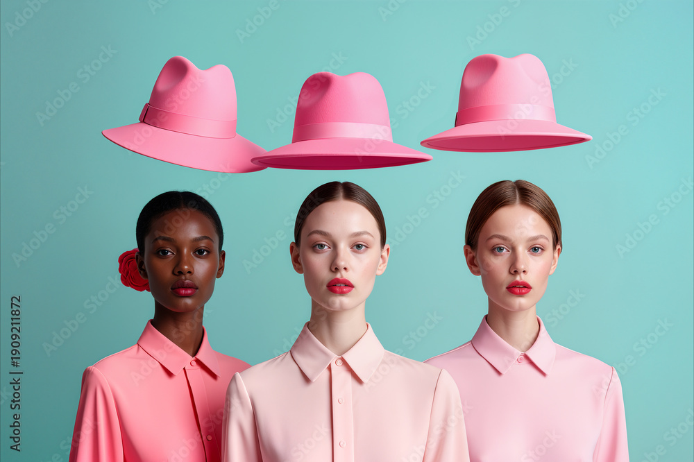 Three fashion models in pink shirts pose against a teal background, with three floating pink hats aligned above their heads in a surreal studio composition. #1909211872