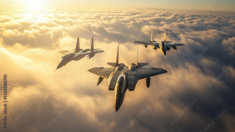 Three fighter jets are flying in formation above towering clouds at sunset, with vibrant hues illuminating the sky. This display highlights advanced aviation skills #1324840741
