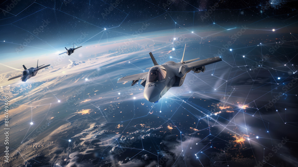 Three fighter jets soaring above Earth with digital network #814749498