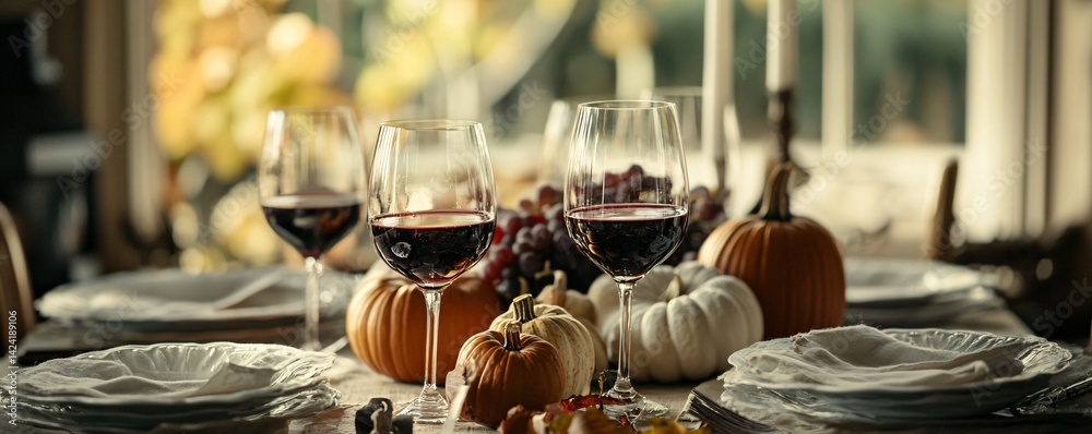 Three glasses of red wine stand on a table with autumnal decorations for a festive thanksgiving meal #1424189106