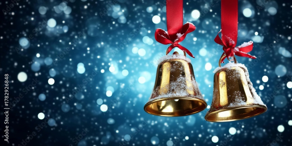 Three golden Christmas bells hanging from red ribbons #1782926848