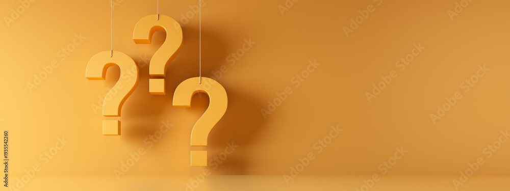 Three hanging white question marks in front of a yellow wall with copy space - 3D illustration #1935542260
