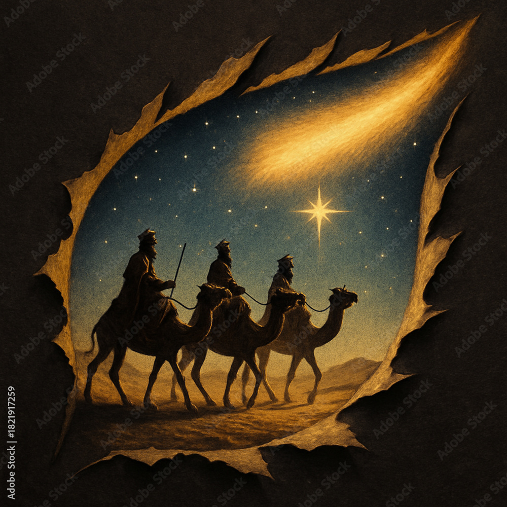 Three Kings caravan comet torn paper jagged tear glowing tail desert Christmas composition #1821917259