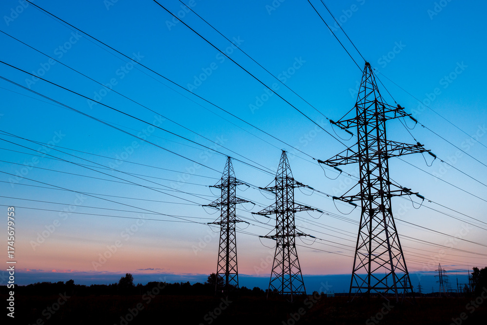 three metal poles of high-voltage power lines against the sunset #1745679753