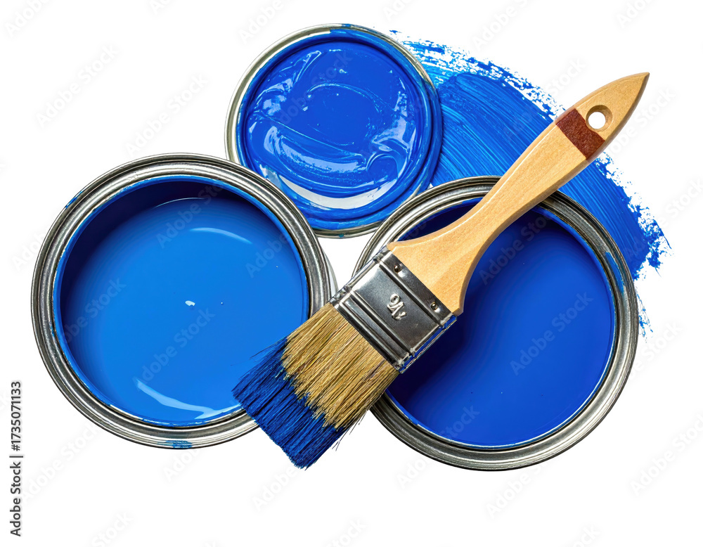 • #1735071133 Three open paint cans and a brush, a blue paint swatch on a black backdrop