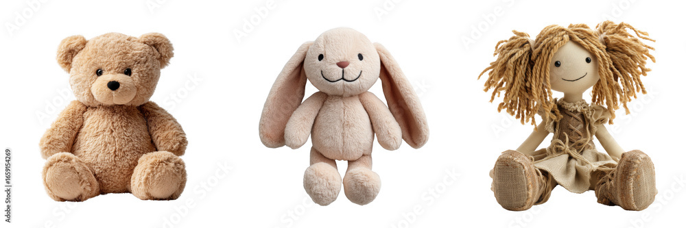 Three plush stuffed toys a teddy bear a bunny and a rag doll isolated on a transparent background image #1659154269
