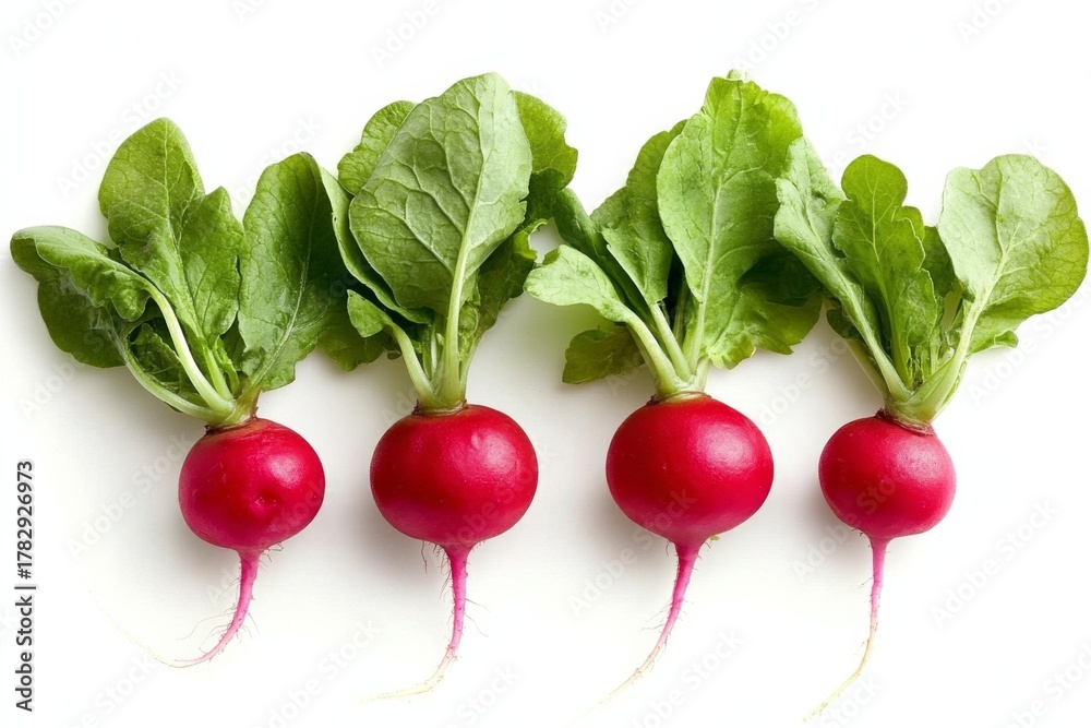 Three radishes their leaves still attached are bright Fresh red radish isolated #1782926973