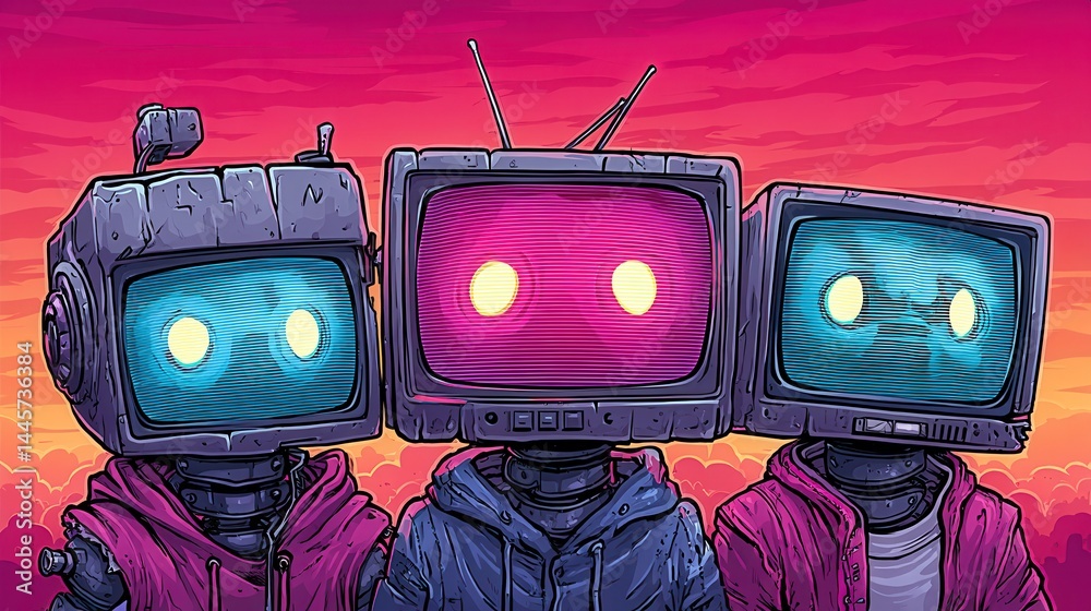 Three retro robots with TV heads in hoodies stand together against a vibrant sunset sky. Neon colors, cyberpunk style, futuristic and nostalgic vibe, perfect for digital art and sci-fi themes. #1445736384