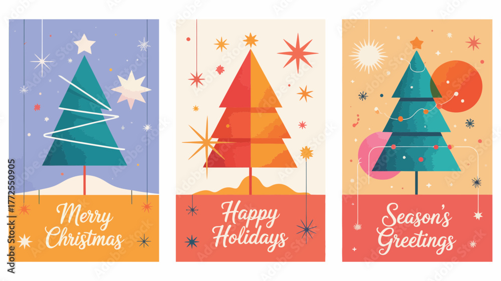 Three retro style christmas tree greeting cards featuring merry christmas happy holidays and seasons greetings messages #1772550905