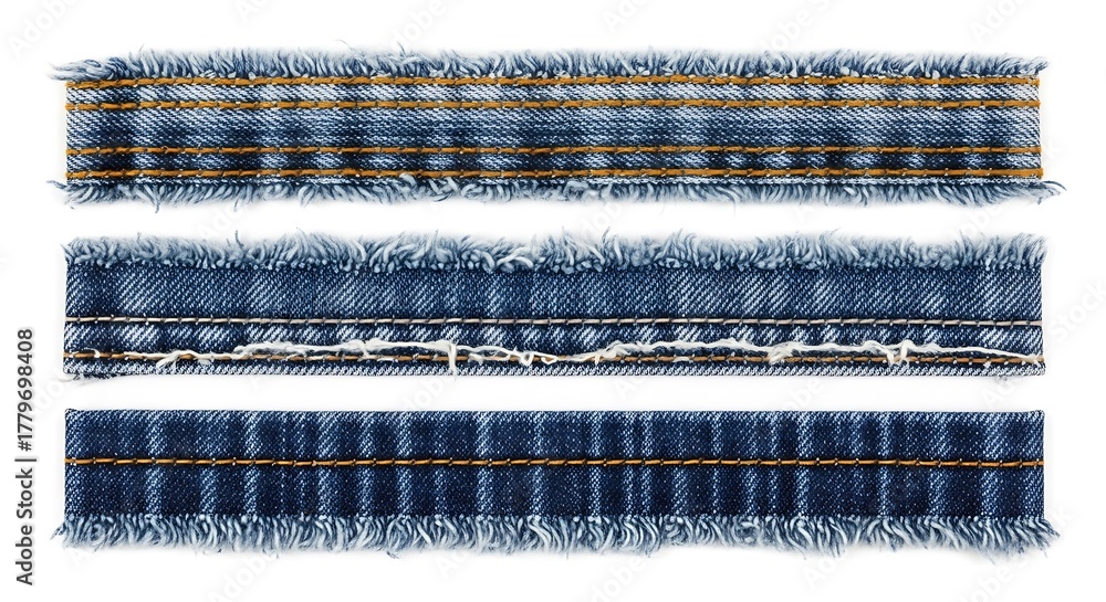 Three strips of frayed denim fabric with visible stitching and texture #1779698408
