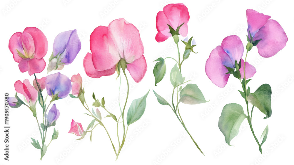 Three watercolor sweet pea flowers in pink hues with green leaves on stems, isolated on transparent background #1909170780