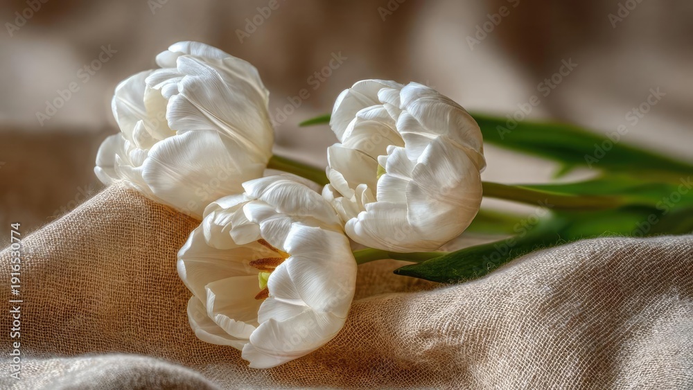 Three white tulips on a beige burlap fabric. Concept White tulips on burlap, Rustic floral still life, Neutral beige backdrop, Minimalist garden bouquet, Soft natural lighting #1916530774