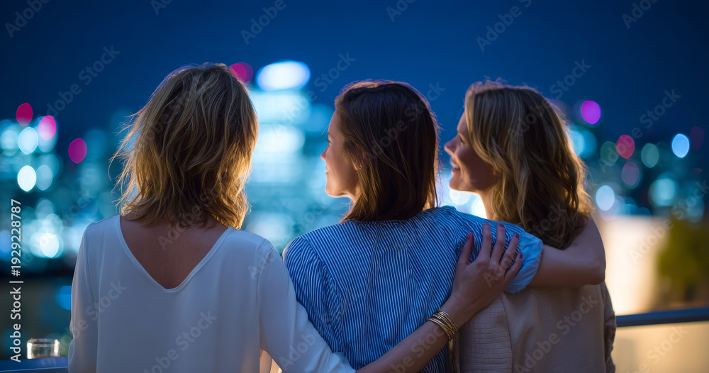Three women embracing and enjoying a nighttime cityscape view from a rooftop with blurred city lights in the background #1929228787