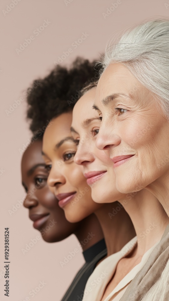 Three women of different ages and races are standing next to each other, smiling #1929381524