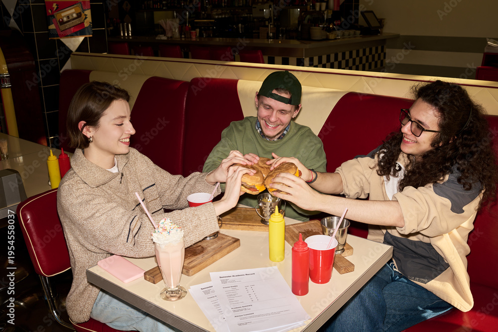 Three young friends sitting in retro diner booth sharing burgers and milkshakes, smiling and enjoying meal together, food and drinks on table #1954558037