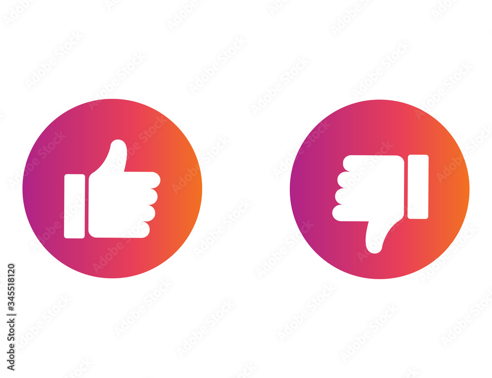 Thumb up and down in colorful gradient design. Ok and negative symbol. Positive or bad choice. Isolated illustration of like or dislike icon. Social button of decision. Insta style. Vector EPS 10. #345518120
