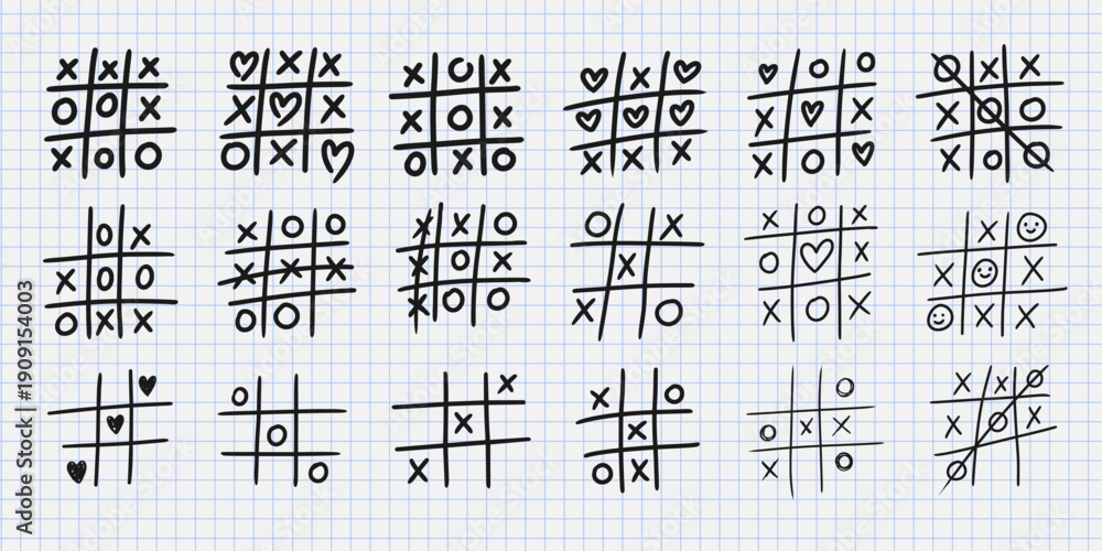 Tic tac toe. Doodle XO game. Hand drawn pencil line game elements, tic-tac-toe play. Sketch brush grid, cross, circle, heart, smile. Drawing playing board. Vector set #1909154003