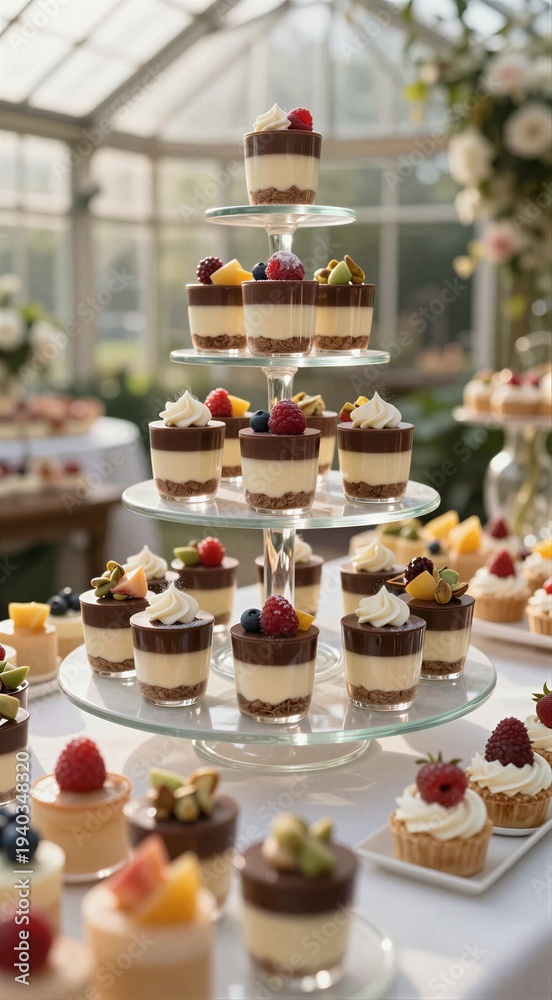 Tiered dessert parfait display with berries and cream for event table background and catering presentation #1940348320