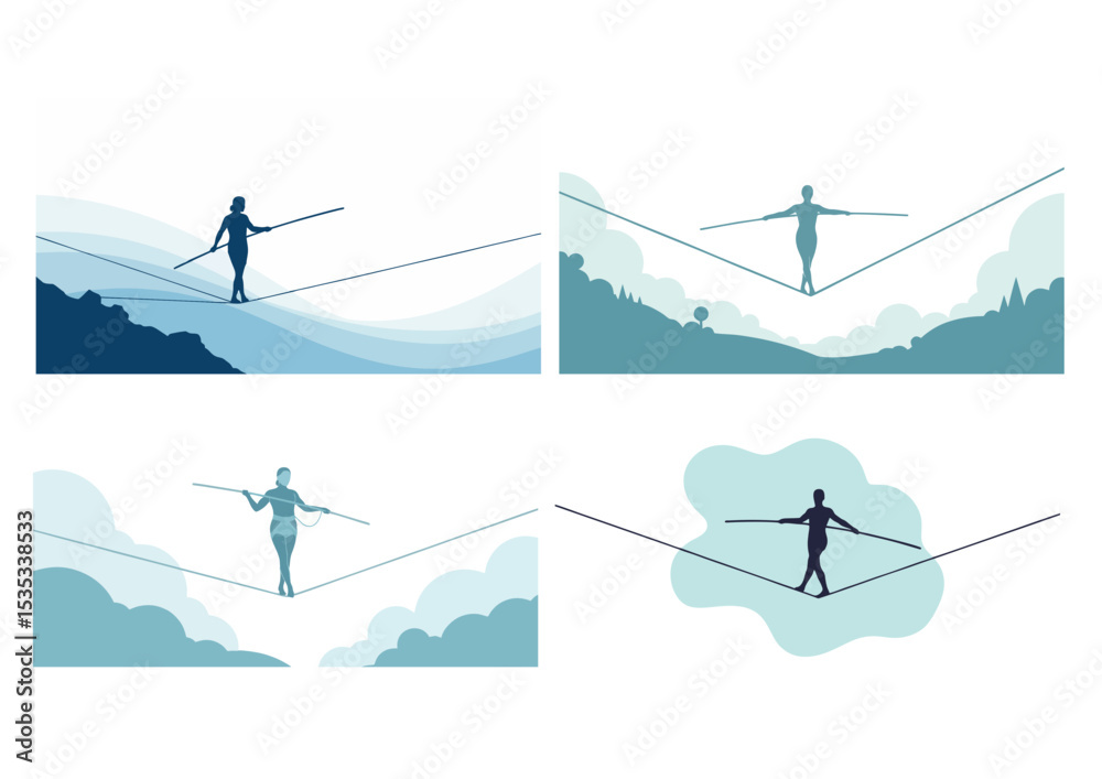 Tightrope walker silhouette in perfect control with pole and soft sky-blue tones on white background #1535338533