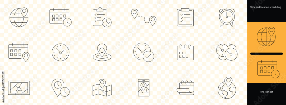 Time and location scheduling icons set. Clocks, maps and calendars. Thin line editable stroke icon illustrations #1937620267