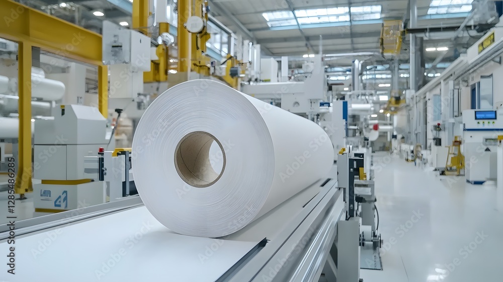 Time lapse footage of a continuous paper roll being fed into a machine and gradually shrinking in size as it moves through the automated production line in a modern industrial factory setting #1285486285