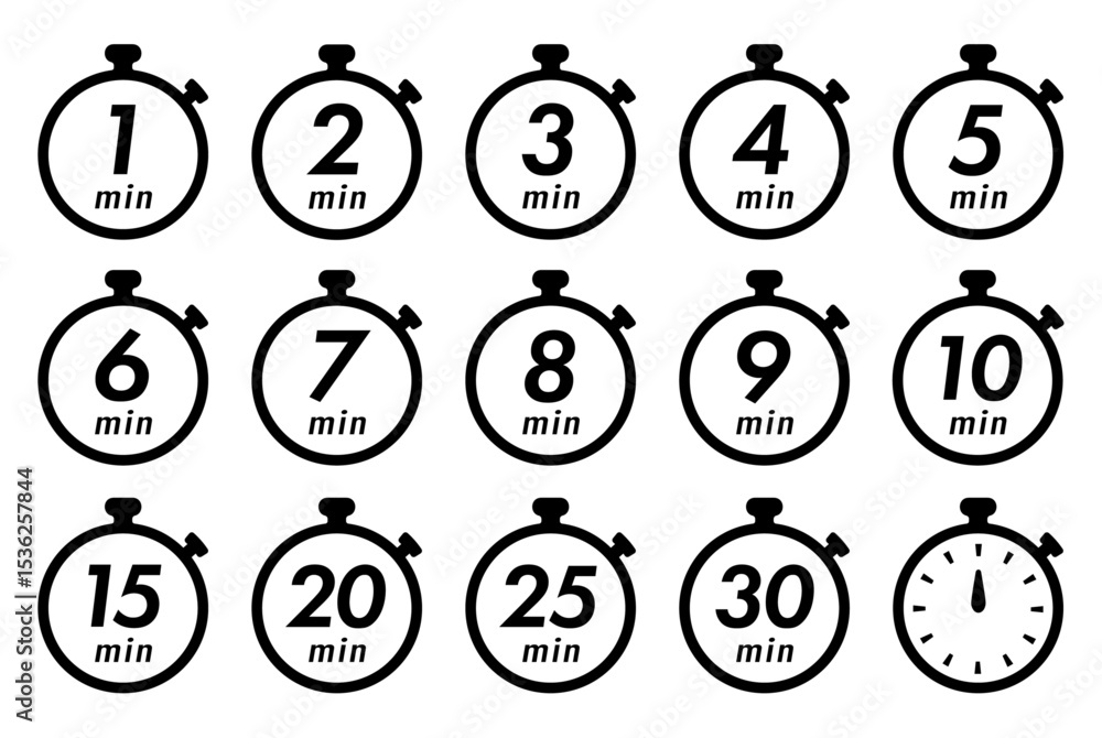 残り時間を表示するタイマー/ストップウォッチ/時計のアイコンイラストデザインセット(timer clock stopwatch 1min 2min 3min 4min 5min 6min 7min 8min 9min 10min 15min 20min 25min 30min 残り時間 シンプル アイコンイラスト ベクター 編集可能) #1536257844