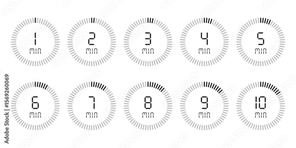 Timer, 1, 2, 3, 4, 5, 6, 7, 8, 9, 10 min. Stopwatch isolated set icons. Countdown timer symbol icon set. vector illustration. #1569260069