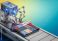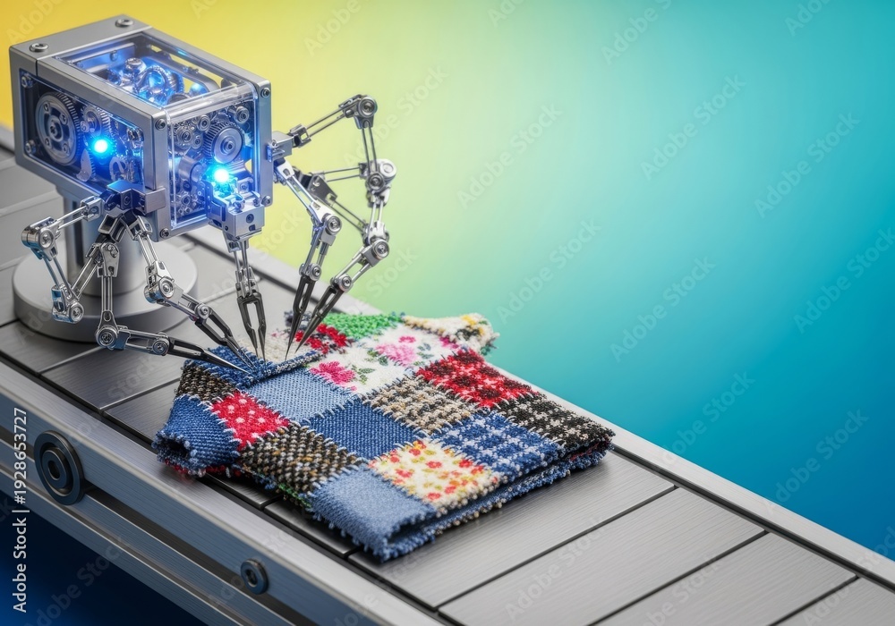 Tiny robotic tailor meticulously assembling clothing items from repurposed fabric remnants on an efficient textile industry conveyor belt, scraps, future, fabric #1928653727