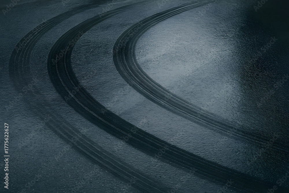 Tire skid marks on wet asphalt road surface at night, cinematic accident trace with moody light reflection, vehicle drift evidence pattern concept, dark street investigation background, automotive dan #1775622627